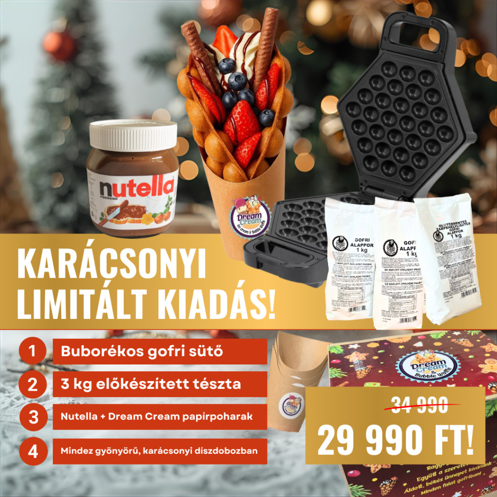 Ez az ünnepi csomag egy komplett, “azonnal sütős” buborék gofri élmény: csak keverd be a tésztát a csomagoláson jelzett arányokkal, melegítsd elő a Lund 700 W-os sütőt, és 4–5 perc múlva már kész is a ropogós-kívül, puha-belül gofri. A Nutella mogyorókrémmel, gyümölcsökkel vagy tejszínnel villámgyorsan karácsonyi desszertté varázsolható. A csomagban gluténmentes mix is van – így az ünnepi asztalnál mindenki talál magának finomságot.