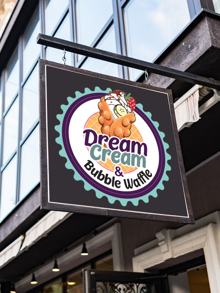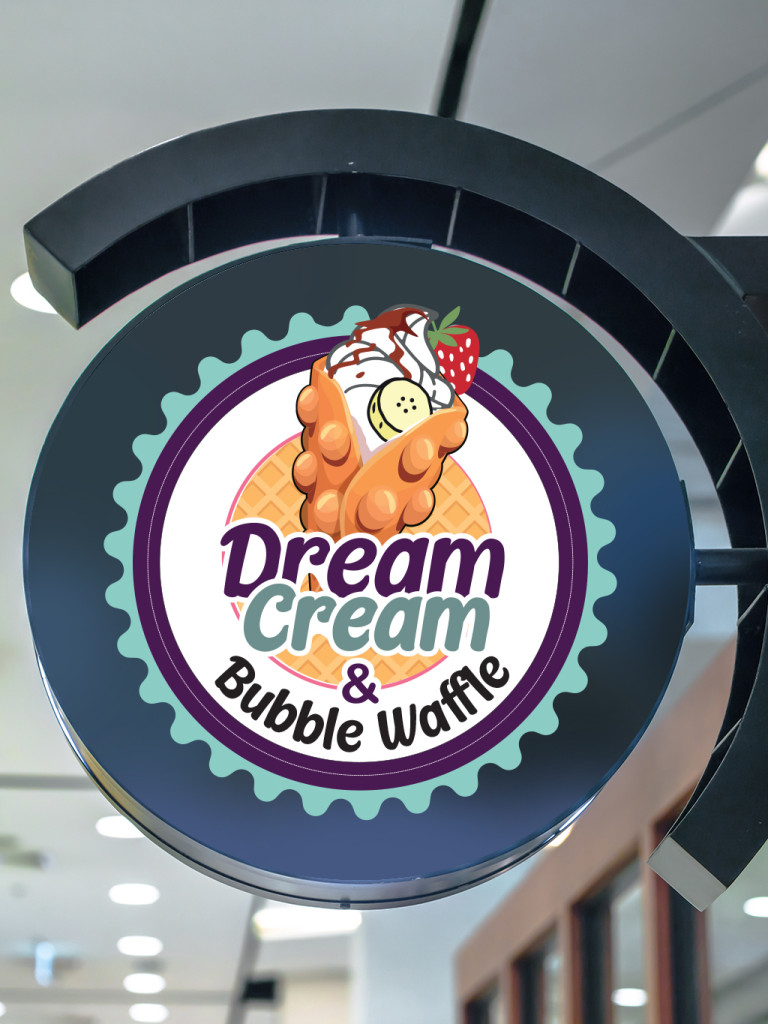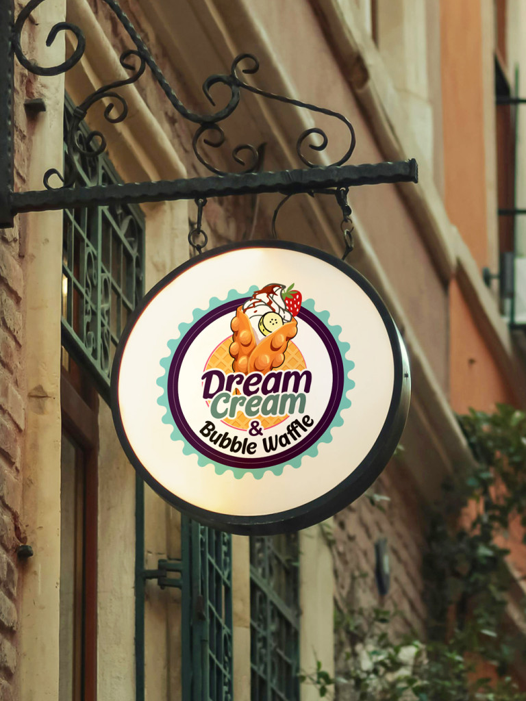 Dream Cream Kft. logó (buborék gofri ábrázolás, kör formában) 30cm átmérőjű. A logó egyedi tervezésű, jogvédett grafika, amely a cég arculatát tükrözi: egy kör alakú ábrázolás, amely egy tölcsérként feltekert buborék gofrit jelenít meg toppingokkal.