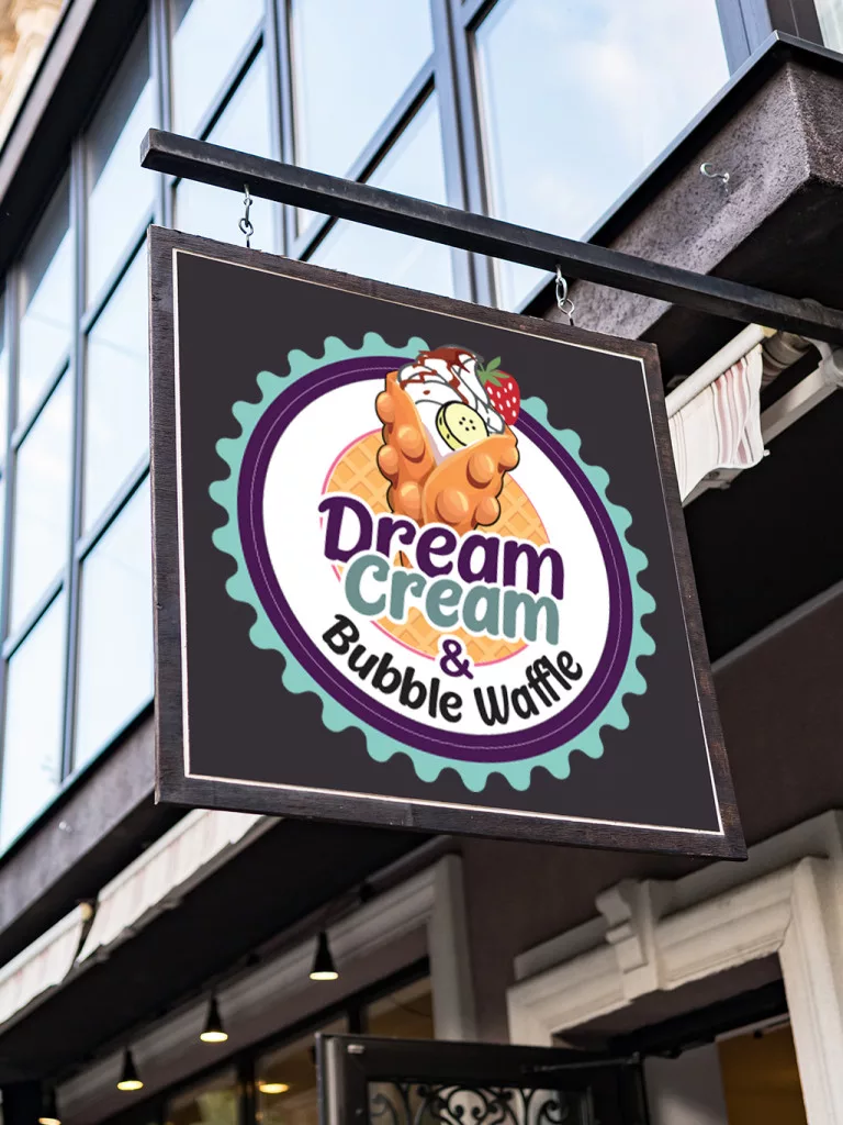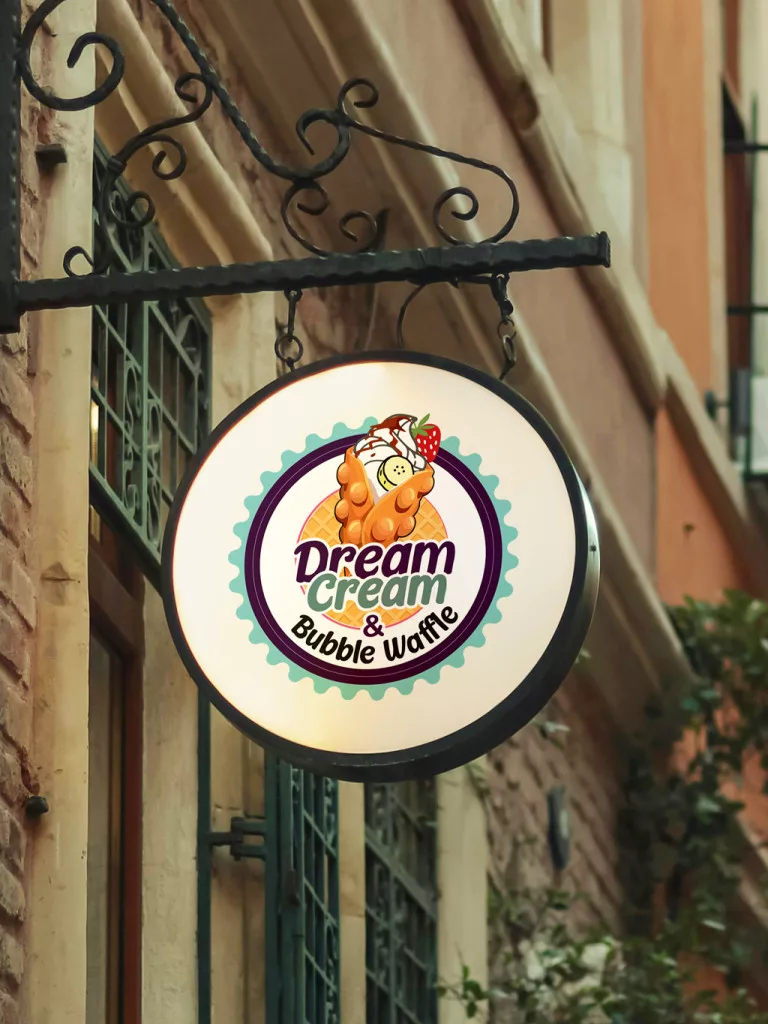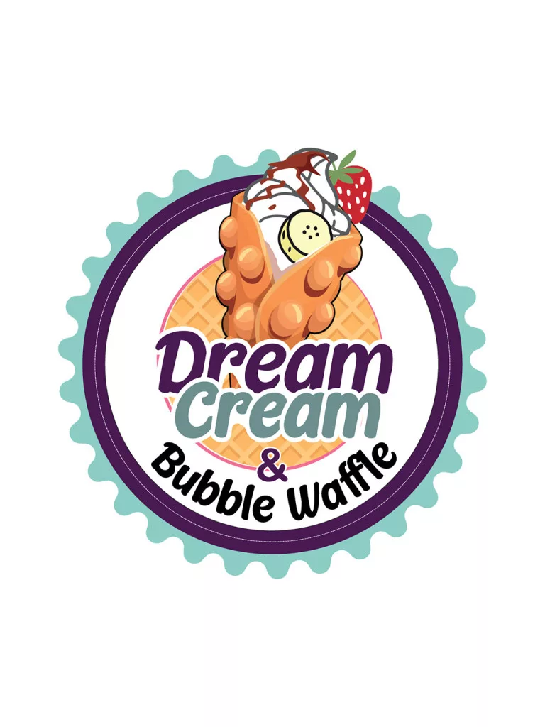 Logo Dream Cream (zobrazenie bubble waffle v kruhovom tvare) s priemerom 30 cm. Logo je jedinečný, právne chránený dizajn, ktorý odráža identitu značky: kruhová ilustrácia zobrazujúca bubble waffle stočenú do tvaru kornútka s toppingmi.